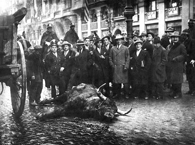 1928. Las ovejas y vacas de muchos ganaderos madrileños pastan cotidianamente por la ribera del Manzanares, el río que serpentea al sur de la capital. Uno de los astados se escapa y decide adentrarse por el Puente de Segovia hacia el centro de la ciudad. Sembrando de heces y pánico los adoquinados más ilustres del reino. En Madrid, capital del mestizaje más castizo, no escaseaba por entonces la afición y, sin arte de magia, un torero podía aparecer de cualquier esquina y así fue. Diego Mazquiarán o el “Fortuna”, será recordado como el único torero que ha matado a ‘abrigo’ y espada un morlaco en plena Gran Vía. Fuente.
