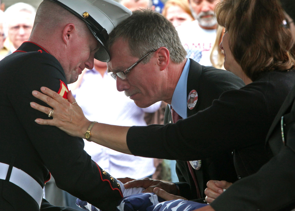 Phillip Serwinowski (centro), padre de Lance Cpl. Timothy G. Serwinowski, apoya la cabeza en la frente de la Marina Lance Cpl. Nathan McCormack, de Garden City, Michigan, mientras se presenta la bandera a la familia fuera Amigone Funeral Home en Sheridan doctor en Tonawanda, Nueva York el Sábado, 26 de junio 2010. La madre de Sally Serwinkowski Urbano llega a un brazo de apoyo a la marina de visita que sirvió en el mismo pelotón como su hijo y escoltado al palacio, después de su muerte. Serwinowski fue asignado al 3 º Batallón, 6 º Regimiento de Marines, 2 ª División de Marina, II Fuerza Expedicionaria de Marines, Camp Lejeune, Carolina del Norte, y fue asesinado el 21 de junio 2010, mientras que el apoyo a las operaciones de combate en la provincia de Helmand, Afganistán. (Foto AP / Robert Kirkham)