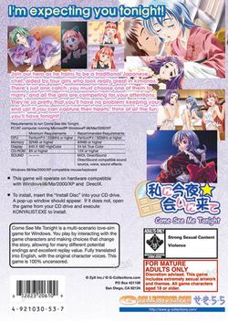 Come See Me Tonight is a multi-scenario love-sim game for Windows. You play the interactive game by moving through the game story and making choices that affect the outcome, allowing for many different potential endings and excellent replay value. The game features the original Japanese voices along with an accurate English translation. This game is 100% uncensored, too, for full enjoyment of the erotic interactive story. Includes a great "hands free" feature too! (C) G-Collections, original game by Sekilala.